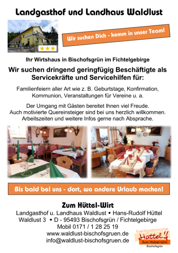 2026 Landgasthof und Landhaus Waldlust + Waldlust 3 + D-95493 Bischofsgrün + Tel. (09276) 9 810 + Fax 9 81 40 + Mobil (0171) 12 82 519 + info[at]waldlust-bischofsgruen.de